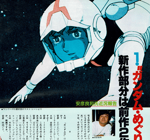 「ガンダムIII」はど うなっているのか、 とくに新作部分の絵 というのが は!?ー いま『ガンダム』フ アンの話題の中心。 というわけで安彦氏 宅を訪ねたのだが「じつをいうとつぎの仕事 にもボチボチとりかかっているのです」(安彦 氏)というビッグ・ニュースもキャッチ。 以 下は、その全インタビュー。 (9月10日取材)