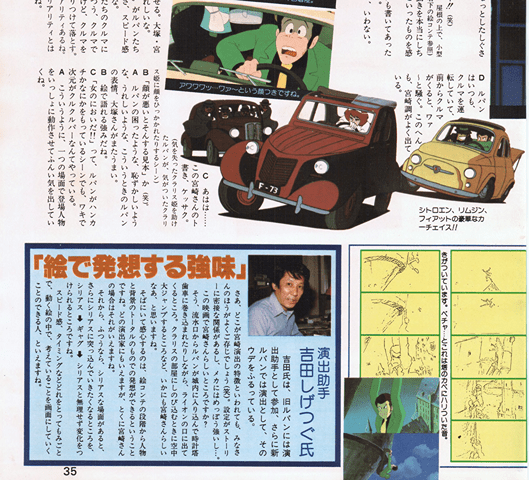 原画のコーナー一番奥にすわっているのが三輪孝輝氏。「まだはじめたばかり。先生の絵コンテの指示にそって原画を・・・・・」目の前にカガミがおいてある。何するためです?(ご自身の顔でもながめるためかと思いきや・・・)「手の動きなどを角度を変えて見るため」とのこと。「三輪氏は男くさい芝居がうまい」(杉山氏)だから、ボルカン、ブーンなどを担当しているという。おとなり『パンダの大冒険』の高橋信也氏は不在。まんが家の小室コータロー氏。「手塚氏のアシスタントだったけど、いまはもう有名なまんが家」と杉山氏。いや·····と照れて「どちらかというと素浪人ですよ…(笑)」というわけでおとなりへ。(読者には、かけ足で申しわけありませんが、いずれ、ひとりひとり、ちゃんとアニメージュに登場してもらいますので、悪しからず)さきほどから、数十枚の原画をパラパラパラパラやっている人がいる。おっ、こりやちょうどいい。何かありそうだ……。この人、原画の小林準治さん。―何でしょう、それは?「これはゴドーがクルマに乗って未来都市の中を走っていくところ」「彼は本当はエフェクト的要素の強い部分の担当」と杉山さんは説明してくれたけど、エフェクトがよくわからない。ようするに、波とか風とかの自然現象」に代表されるものだそうです。ところで、いま小林氏が見てい原画はぜんぶで70枚。映画がはじまって10分~15分くらいにでてくるシーン。この50秒のクルマの走りのシーンに原画70枚、動画600枚を使う「そうで、なにやこの映画のスゴサの一端をかいま見た思い。もう一度パラパラっとやってもらうと、クルマだけではなく、背景にザッと描いてある未来都市も、走るにつれ角度や位置が動いていく。「これはあとで訪ねる美術の人との綿密な打ち合わせが必要」(杉山氏)とのこと。そりゃそうだ。(それにしても大変そう!!!元藤郁子さんは人間オルガの部分を担当。つまり、オルガは変身ロボットだから。かわいらしい女の子の部分とメカの部分があるわけ。ガンバってください、と声をかけるとなぜか女の人にはやさしいのだ・・・・・・)よゆうある感じで「そう、ニコニコしていられるのもいまのうち。まもなく戦争状態ね(笑)」白川忠志氏はオルガ、ピンチ日の原画担当。「いまはキャラの試行錯誤の段「階」だそうで「自分でいいと思っても演出からダメが出杉山氏の顔をチラリ。たりして・・・」