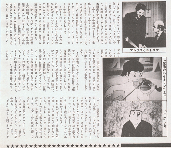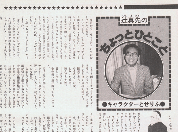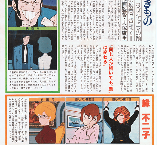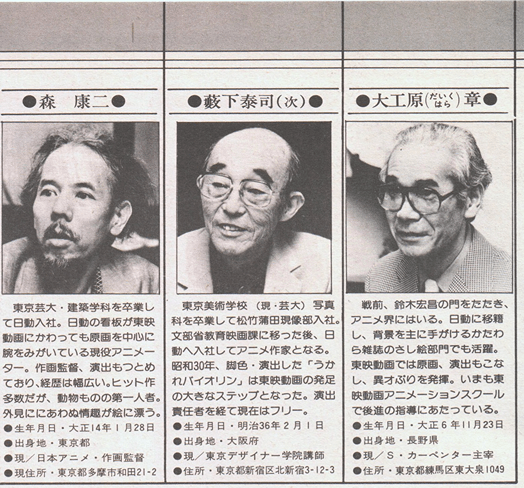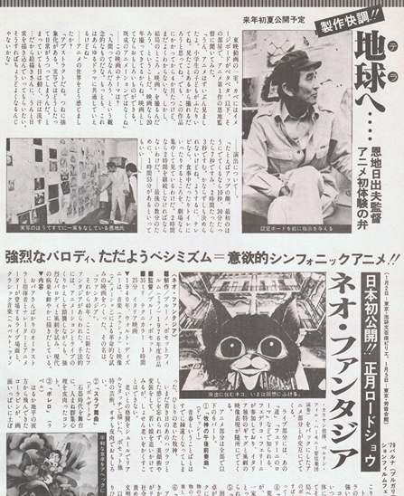 東映動画の一室。カベにはイメージボードがベタベタ。以下、その部屋で、アニメ第1作の恩地監督に聞いてみた。「うん、アニメはずいぶん見ましたよ。小学生の子どもがふたりいてね。見たことあるから撮れるだろうと思ってね。でも、この作品にかかってから4か月たつけど、まだよくわからないな。しかし、結局のところ”映画”を撮るんだろう、ということだ。映画なら20年撮ってきてるからね。映画としてならおもしろいものができる。既成のアニメーションではなくね」この映画のテーマは?「人間ってなんだろう、という観念的なものだな。もっとも、これはあらゆるドラマに共通していえるけどね」―アニメの世界をどう感じましたか?「アブストラクトだね。つねに抽象化がある。実写ではどうしたって日常がうつってしまうんだ。とまっていても目は動く、汗は流す・・・だから絵描きさんに、うんと日常を描き込んでいってもらいたい。そうすればちょうどよくなるんじやないかな」演出について・・・。「たとえばアップの顔。最初のほうにでてくるなら10秒、30分たったら7秒ですみ、2時間たったら3秒ですむ。かならずしも決められないけどね。ようするに、テレビなら、食事中だったりトイレにいったりするところを、劇場なら集中して見ているわけだ。2時間なら2時間を継続しなければならないわけだ。最後の数分のために、1時間55分があるといってもいい…..