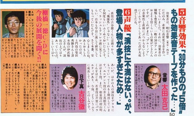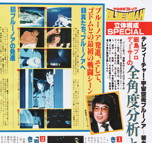 テレフィーチャー形式(2時間7ク)からはじめた点は、試みとしても大成功”だと思っています。ただSF資料の消化に少々、とまどった点もあり、1時間30分を設定の説明だけについやしてしまったのは、多少、つめこみすぎのきらいがありましたね。よくばりすぎたのかな(笑)。ともあれ、これからのシリーズでは”ドラマ”部分に重点をおき、たっぷりとストーリー展開をたのしんでもらうつもりです。羽根章悦氏の描くキャラクターは、一見、特徴がなく、淡白な印象を与えると思うんです。がそこには、羽根氏一流の持ち味〟というのがある。テレフィーチャーでは、この微妙なニュアンスを、若いアニメーターたちが生かしきれなかった感がありますね。今後は、アニメーターたちにもっと描きこんでもらうなかで、羽根氏のイメージをできるかぎり、生かしていってもらうつもりでいます。それと、メカ部分でいうと、ブルノアそのものの巨大さや質感を表現しきれなかった箇処があり、っとものたりない感じです。今後、メカ部分に関しては、美術撮影の人たちと協力しあうなかで、メカの質感とたのしさを見せていきたいと考えています。美術は、たいへん苦労しました。というのも、海が舞台なので”描写”に苦労がある。たとえば、海の深さを表現するのに撮影のとき、セルの上にパラフィンや板ガラスをのせてみたんだけど、まだ、明解じゃない。海中では深度によって色がちがってくるし、視野の角度によって色のトーン、明るさの段階も変わってくる。その描写がまだまだ完全とはいえなかったので、これからもっと研究を重ねて、リアルな画面作りをしたいと思っています。主題歌は、イメージ刷新でロック調の明るい曲、平尾さんと川崎麻世くんの起用は大成功でした。BGMは、地球側を平尾さん、ゴドム側を宮川泰さん、編曲音楽平尾昌晃船山基紀さんに頼んだのですが、第1話の段階で完成したのがおよそ100曲。かえって、選曲にとまどうほど。というわけで、音楽ディレクターでもある西崎義展さんをひっぱりだすことになったんですが、今回の成功を、シリーズのなかでも十分に生かしていくつもりです。効果音は、映広音響(東京・四谷)にたのみ、非常に高密度な音を作ってもらいました。それに、効果音の種類も豊富で、一般の30分アニメのおよそ5倍くらいもの量ができたんですが、これがまた「ブルーノア」の音楽性と直接にぶつからないようにくふうがこらしてあった点が大成功でしたね。真役の古谷徹くんには前々から、「〝飛雄馬”じゃない」ということを何度もいいふくめておいたんです。で、ラッシュもアフレコ前に見てもらい、台本も早目に渡して研究してもらっていたんです。さて本番、安心しましたね。あとおもしろかったのは、土門役の柴田秀勝さんと清水役の伊武雅之さんが、演技の上ではりあっていた点。こういうはりあいが、ほかの人の演技をプラスにもっていってくれると期待しています。ユルゲンス役の井上真樹夫くんははまり役。また、和泉役の村山明くんをはじめ、若者役は声質にバラエティがあり、今後、どういうふうに成長していくか、たのしみです。