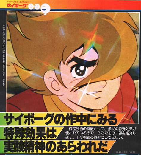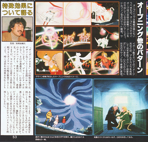 「サイボーグ009」での特殊効果では、あり楽しみにしてます。それは透過光をデザイン化ということを念頭において制例にとると、毎回違ったものが上がって作しています。が、ブラシとかタッチは少なく、その分透過光の、いわゆる撮影のテクニックを一番利用してます。透過光、フィルター、フォーカスなど色々ありますが。セルの上に定着する効果と比較するとカメラマンの腕を駆使することにより、時には思わぬ効果を生むことも悪しの計算が成り立たない方法なのです。これから先も、撮影さんの方から、まだテクニックを全部だしきっていないという要望もあるので少しづつ、こだしにしていき、絵を生かすスパイスとして利用していきたい。