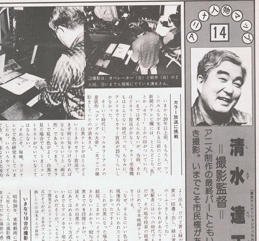 一度でも、東京・高田馬場にいったことのある人ならわかるだろう。国電、西武線、地下鉄などが交錯し、乗降客でゴッタがえし、さらに駅周辺には早稲田大学の学生やらサラリーマンで、夜昼とわずゴチャゴチャ・・・・・・異様な活気を見せているところだ。その高田馬場駅からおよそ200メートル、商店街のドまん中のとあるビルの2階に、駅前をさらにしのぐような熱気あふれているところあの手塚プロがある。いわずと知れた、まんが界の大御所・手塚治虫氏のプロダクションである。そのビルの2階の全フロアー、部屋数にして7つほどのスペース。むろん、手塚氏が原稿を描いたり、アシスタントの人がいる部屋があったり、事務所もあったりするが、今回の訪問先は「火の鳥2772」の製作室である。2部屋に分かれており「現在、総員40人くらい。作画関係25人、美術関係4人、演出関係4人、それに制作5~6人」(制作・山川紀生氏)という配分なのだそうだ。いまは、設定段階がほぼ終わり、作画にかかっているところ。このバカに忙しいところを、杉山卓監督にムリにお願いして案内してもらう。