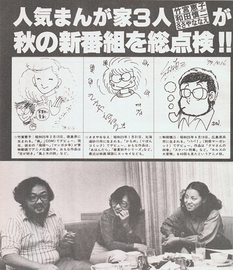 その間、並行してキャラクター・デザイン、メカニック・デザイン、美術設定などの設定作業が進められている。キャラクターの基本デザインには大島やすいち(まんが家)寺沢武一(まんが家)中村和子(アニメーター)高橋信也(アニメータ-)三輪孝輝(アニメーター)正延宏三(アニメーター)湖川友謙(アニメーター)の各氏が参加し、最終的に手塚治虫の手によってすべてのキャラクター・デザインがまとめあげられた。メカニックデザインは御厨さと美(まんが家)が担当し、美術デザインの基本設定にはもとのりゆき(イラストレーター)篠原博士(イラストレーター)松本強(デザイナー)の各氏が担当し、松本強は本製作における美術も、伊藤信治とともに担当している。以上が設定班として、本製作にかかる前の基本設定を監督の統括のもとにつくりあげていくというわけだ。このほか『火の鳥2772』では作画監督のいない”キャラクタ一制”をしき、その体制的不備をおぎなうため、演出グループ(中村和子、石黒昇)をおいたりしている。”キャラクター制”ときいて、アニメ関係者は、いまなぜ?と思うだろうし、最近のファンの人は作監がいないということで奇異な感じをうけることだろう。これなどの説明もしなくてはならないが、誌面がつきた。来月もこれらの説明と、この作品にかかわっていく人間とその役割などをご紹介していたいと思う。(文中敬称略)