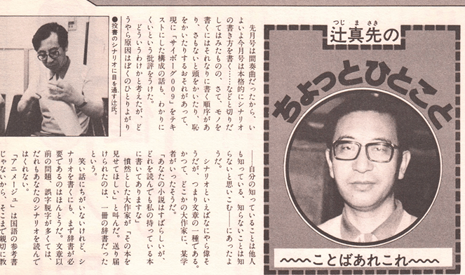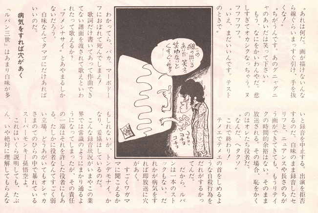 塩谷さんが少しまえこごみになって全身で叫ぶ。 テストとはいえ みんな真剣な表情でフィ ルムと台本を見つめる。 ときどき、片手にもった 鉛筆で、なにやら書きこ みがはいる。 ”健を演ずる森さんは?” と見まわすと、スクリー ン前のテーブルで、お菓子を食べ ながら、ナレーターの仲村さんと 小声で談笑している。 健の性格を つかみきっている人のリラックス した雰囲気だ。 スタジオ全体のなごやかな空気 この作品を愛し、 役をつかみ きった人々ばかりだから生まれる のかもしれない。 テスト終了。 水本ディレクター のチェックがあったあと、いよい よ本番の開始だ。 スタジオの空気が変わる。取材 私まで背すじをピンとのばさな ければいけないような気持ちにな ってくる。 総裁Xとゲルサドラの会話シー ンが始まった。 ゲルサドラ役・池 田さんの録音姿には特徴がある。 半陰半陽という設定だからだろう か、歌舞伎の女形ふうにしなをつ くってセリフをいう。 “わざとですか?” とたずねたら、自分 では意識しないが女 性的な役柄だと、体 がしぜんにそう動く とのこと。役になり きるには、体からと いうことだろうか。 総裁Xの田中さん がとちった。パッと照明がつく。 大平さんが『取材が入ってあがっ たんでしょ』とすぐ助け舟をだす。 田中さんは「すみません。 とちり でもしないと取材でとりあげても らえないと思って……』と照れ隠 しの苦笑い。 ひとしきりの談笑のあと、録音 再開。 今度はすんなりとオーケ だ。 録音はまだまだ続く“声”だけ の表現に情熱をかたむける人たち の熱気を十分に発散させながら・・・