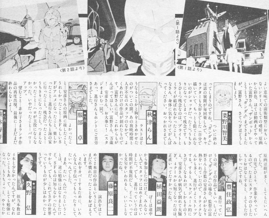 Akira Saijo: 「ガンダム」 を中村プロでやるにあたり富野さ んなどの意向で、いままでの作品 とちがってできるかぎり中村調を おさえて、キャラクターに忠実に 合わせるよう、中村一夫はじめス タッフ一同努力してきました。私 もロボット物は好きなほうですの で、楽しくやることができました。 ガンダムが終わることを聞き、残 念ですが次回の作品に期待してい ます。