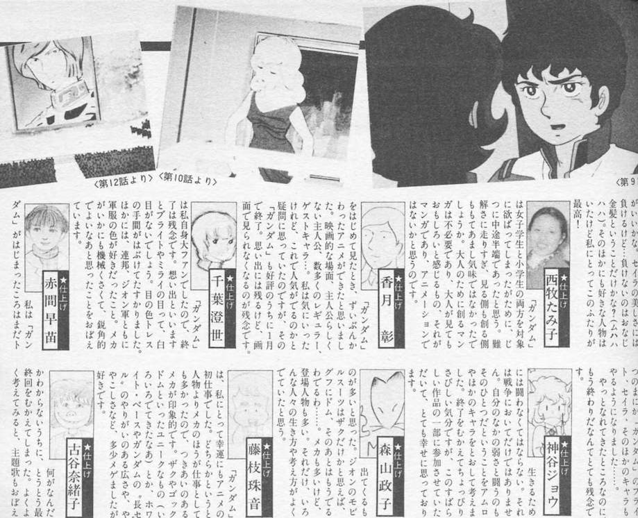 赤間早苗 (仕上げ): 私は「ガン ダム」がはじまったころはまだト レスの練習のときて、仕事に関し てもただもう夢中でした。何度か の失敗にもメゲずに。それでもい つのまにか「ガンダム」のブライ ト、セイラ、そのほかのキャラも やるようになりました・・・・・・。 やっとなれてきたところなのに、 もう終わりだなんてとても残念で す。