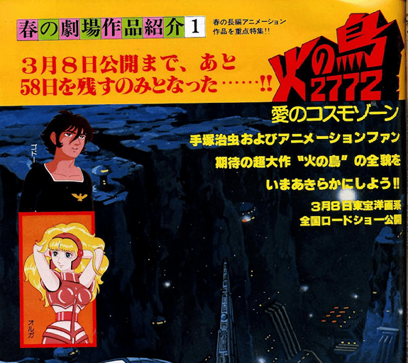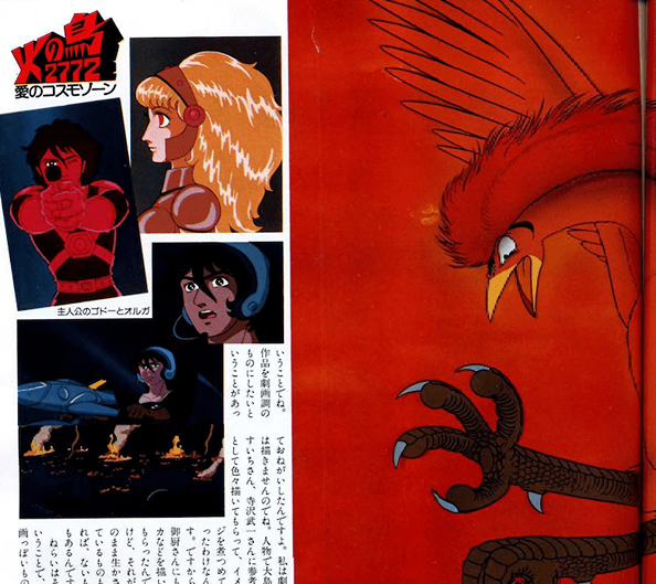 「火の鳥」はすでに東宝系配 給で市川崑監督による「火 の鳥(黎明編)」が公開 されている。そのた めか、今回の新作は 原作である”ヤマト ・宇宙編”の制作に なる…………という声をフ ァンの多くからきいた。 だが、新作は予想を大 きく裏切って、オリジナ ル作品でいくと発表された。 そこで手塚治虫氏に「火の鳥」の 基本的な制作の部分について、いく つかの質問をしてみた。