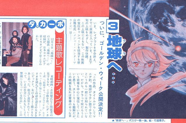 The recording for the theme song is held December 6th.12月6日『地球へ・・・』の主題歌『地球へ…』の収録が、日本コロムビア第4スタジオでおこなわれた。東映動画・有賀健氏など関係者の見守るなか、この曲を歌ったダ・カーポ(「結婚するって本当ですか」などのヒット曲で知られる)は「シナリオを読んでこの話の設定の大きさにビックリ。女の人でよく描けるなあと思った。能力で選別されていくって、いまの社会にもあるでしょう、警鐘にもなっている作品」と、この作品についてふれたあと、主題曲の感想を「LPではこういったPOPS調をよく歌うけど、シングルでのPOPS調の曲ははじめて。活気があり、ワクワクする。メロデイも歌いやすくのりやすい」と語り、ほんとうに収録がたのしいといった感じだった。シングル盤は2月1日日本コロムビアより発売。(作曲・小田裕一郎作詞・竜真知子)