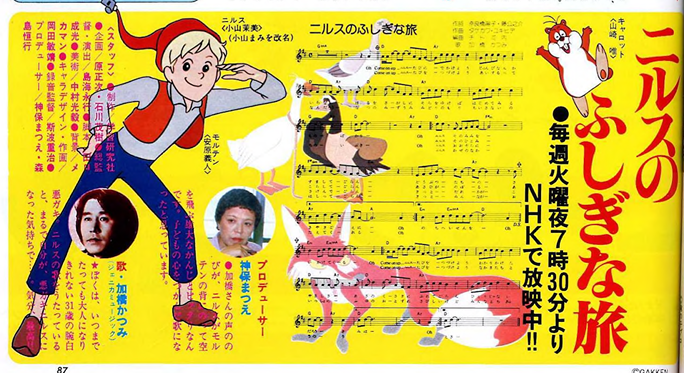 Suda.「キャラはほとんど原作のとおり。た だ、雑誌の絵は、コマの制限のためだ と思うが、寸法が少しちぢんでいる感 じがする。アニメの場合は比率をピッ チリ決めなければなりません。キャラ の色? 背景にとけ込むような自然な 色をつかいたいという恩地監督の意向 で、原色はほとんどありません」