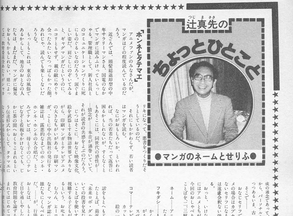 Tamiko Nishimaki: 「ガンダム」 は女子学生と小学生の両方を対象 に欲ばってしまったがために、じ つに中途半端であったと思う。難 解さに走りすぎ、見る側も創る側 ももてあまし気味ではなかったで しょうか。大人のために創るマン ガは不必要であり、大人が見ても おもしろいと感じるもの、それが マンガであり、アニメーションで はないかと思うのです。