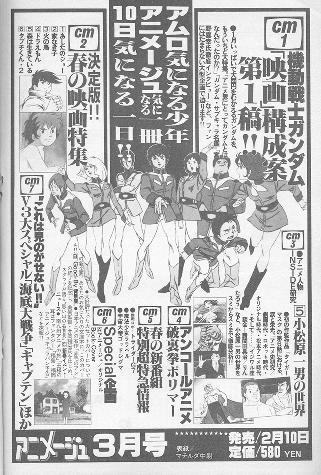 Makoto Imaii: 「機動戦士 ガンダム」は、もうすでに54年度の アニメの最高傑作との評価がきま の谷 ったようです。正直いって、 これほどの人気をだ 下時点で、 が予想しえたでしょう づく人気番組の番宣というのは、 やっていて楽しいものだと実感し ています。しかし、制作スタッフ のご苦労や熱心なファンの要望に どれだけこたえられたかと思うと、 まだ心残りの部分があります。