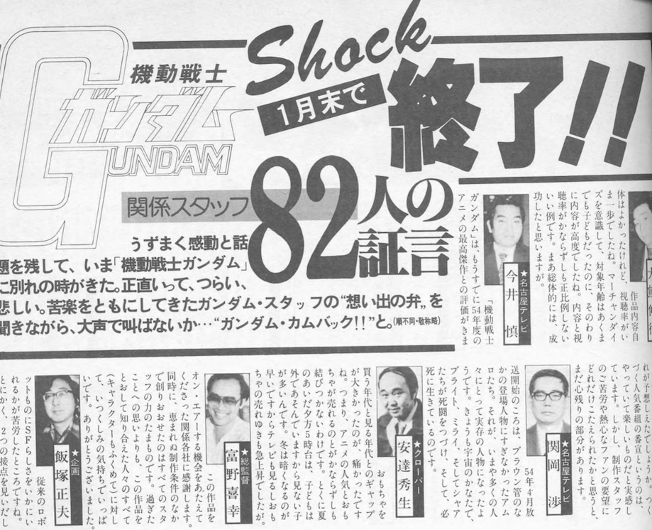 Hirotaka Suzuoki: 「ガンダム」 が終了するといわれてもいまの段 階では、これからのドラマがどの ように展開していくのか、まるで 謎であり、興味しんしんといった ところです。ただ最後まで「ガンダ ム」を応援してくださったみなさ ん、10か月あまりでしたが、どう もありがとうございました。