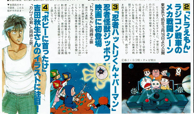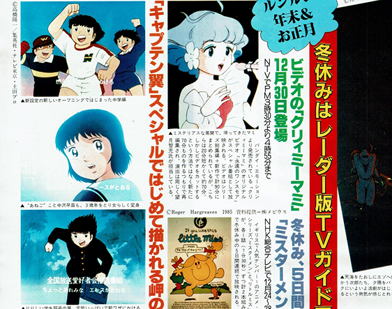 pg. 46-47: Kamui no Ken, Doraemon, Ninja Hattori-kun, Bobby ni Kubittake, Creamy Mami, Mr. Men, Captain Tsubasa