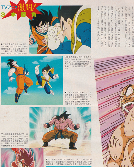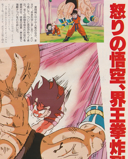 「Z」になってからの悟空は、どこかふんい気がちがってきている。全身に怒りをみなぎらせてピッコロ大魔王と戦ったころや、武道会決勝で闘志むきだしのワクワク顔でマジュニアにぶつかっていったときにくらべると、最近の彼は、闘志や怒りをグッと内側にためこむようになっている。多くの仲間の命を奪ったナッパに対して怒りを感じながらも、最後の界王拳を放つまで、ずっとおさえて戦っていた。たび重なる強敵との戦いや、息子を守らねばならない父親としての意識が彼を成長させたのか。たんにおとなびてきたというよりも、寡黙な戦士の風格さえ出てきた感じだ。強さだけではなく心も一段と成長した悟空、最強のサイヤ人ベジータに対してどんな戦いを挑むのか。