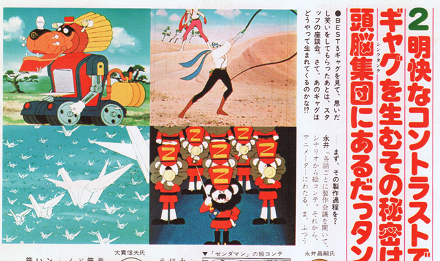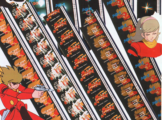 飯島「オープニングを見ることで、より中味 をみたいという気持ちを起こさせるのが役割 りのひとつ。そのためにはあまりゴチャゴチ ャせず、シンプルななかにキザというかクー ルに、かっこよくみせたりという方法を多く もちいていますね。画面にひきつけることに より、主題歌などもおぼえてもらわねばなら ないし、ですから動画的にも手をかける、 いじな部分ですね」
