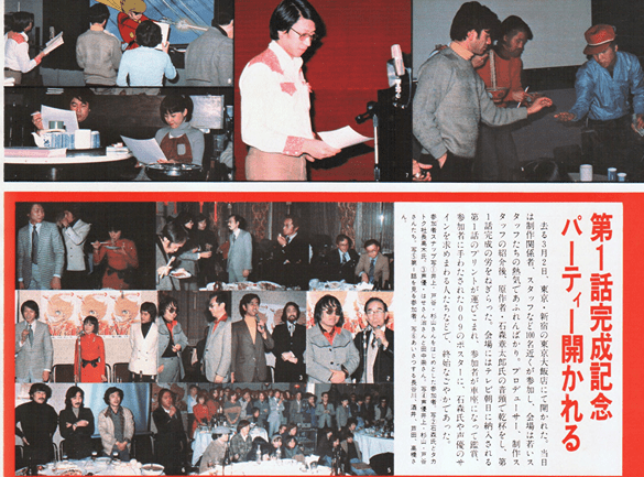 去る3月2日、東京・新宿の東京大飯店にて開かれた。当日 は制作関係者、スタッフなど100名近くが参加し、会場は若いス タッフたちの熱気であふれんばかり。プロデューサー、制作ス タッフの紹介後、原作者・石森章太郎氏の音頭で乾杯をし、第 1話完成の労をねぎらった。会場にはテレビ朝日に納入される 第1話のプリントが運びこまれ、参加者が車座になって鑑賞、 参加者に手わたされた009のポスターに、石森氏や声優のサ インを求めまわる人たちなどで、終始なごやかであった。