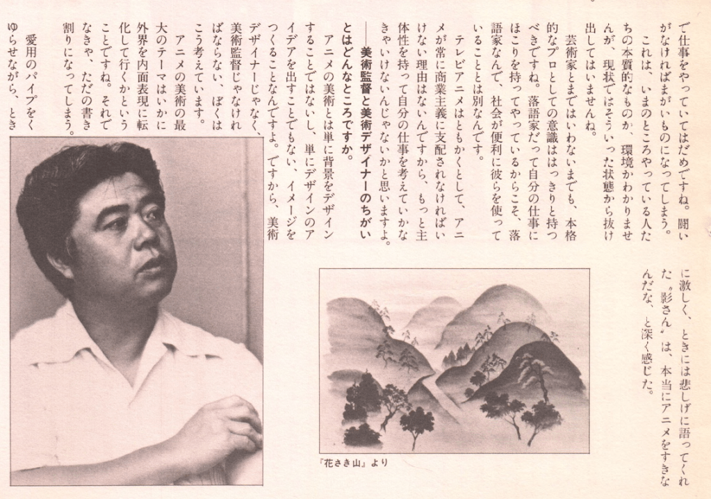「ええ、少しばかりおくれていますが、追い込めばなんとかなるでしょう。手塚先生のイメージどおりの作品を仕上げなければ・・・。 『バンダー」はテレビ作品であっても、劇場公開できるだけの質と内容を持った作品であることを前提にがんばっています。質の向上を願えば時間に追われます。だからといって、時間がないか質を落としてよいというものではありません。手塚先生のきびしいチェックのもとで、みんな一つ一つていねいに作っています」手塚先生のチェックはきびしい。原・動画から背景まで目を通す。時間が迫っているというなかで、目の前に上ってきた背景1枚を、金田さんと話の末に、すべてイメージを指定し、色をやりなおしにまわした。「先生は不完全と思われるものには絶体、首をタテにふられません。 100パーセント完全なものを望むのは無理なことかもしれませんが、なるべ100パーセントに近づけるよう努力は惜しみませんね。あれほどの情熱をぶつけられると、こちらも同じように答えねば・・となります」『バンダーブック』にかける手塚先生の情熱はすごい。先生に話をうかがう。