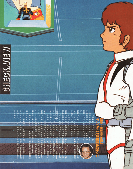 Tomino:「複合的に戦争を体験し、サイド7にいた8人が 運命共同体としてたがいの相互認識をふくめチームワ ークができあがりつつあるというところが、いままで の話でした。これからは、この状態の中で、このまま ではいけない 何とかしなくてはと現実を見つめたう えで行動していく人間を描いていくつもりです」