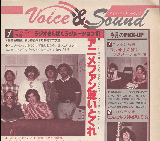 「若ダンナーッ!」というのは、こ の『こんにちワ神谷明です』の中の、 『東食ミュージック・プレゼント』 で、毒蝮三太夫さんが、神谷さんを 呼ぶ声。朝の9時15分、家族を送り 出したお母さんたちの耳に、〝ダ 神谷明さんのワイドDJ が、届けられるという趣向なのだ。 この『こんにちワー 』は昨年10 月までは、近石真介さんが担当していた 番組で『テレフォン身上相談』『秋山ち え子の談話室』『交通情報』など、もり だくさんのコーナーをもうけて、奥様と スタジオをナマで結んでいたワイド番組。 今回も、9時15分から11時5分まで、 コーナーとコーナーの間のおしゃべりや、 神谷さん自身が受け持つ『神谷助教授の うきうき研究室』『ママぼくわたしのう きうき伝言』などのナマ番組だ。また、 今までDJといえば、ヤング向けがほと んどだった神谷さんにとって、20歳後半 からお年寄りまで、幅広い聴取者に語り かけるのは初めてのこと。そこで、TB Sラジオのパノラマスタジオにおじゃま してみた。 このスタジオは、TBSでも最新鋭の 機材をそろえた外の見えるスタジオ。 壁 には温度、湿度などが表示されるボード もかけられている。そのたくさんのメカ のひとつひとつを、スタッフの人が説明 してくれる。なにせナマ放送などという と、緊張しておっかないスタッフにジロ リとにらまれるのでは、と思っていたが とてもリラックスムードで、楽しい雰囲 気なのだ。おまけに、神谷さんを待つ間 に、コーヒーまでごちそうになったりし て役得なのです!) 午前9時3分、神谷さんがスタジオ入 り。さっそく武市ディレクターと打合せ に入る。さすが毎日放送している番組だ けあって、すみやかに準備OK。さあ、 いよいよ本番開始だ!!! 近石さんから神谷さんへのバトンタッ チの理由は、まず神谷さんが近石さんと は違ったタイプのパーソナリティだから だということだ。 「パーソナリティを変更するのに、前任 者と同じタイプの亜流では、まったく意 味がありませんから」 プロデューサーの斉藤さんは言う。 おちついたしゃべりの近石さんから、若 々しくはつらつとした神谷さん。身近に 感じられるDJをめざすこの番組でいえ ば、近石さんは”おむかいのおじさん” で、神谷さんは”おとなりのお兄さん” といったところか。 「ラジオっていうのは、底の深い仕事だ と思います、とにかく、どんな人が聴い てくれているかわからない中で、僕自身 の感じたものが聴いている人に 届くような放送を心がけていま す。 まだ始めてから7か月たら ずですから、近石さんに追いつ こうなんて虫のいい考えではな しに、まず自分自身を確立して いこうと思っています」 番組の途中、テープ収録のコ ーナーのあい間に、神谷さんは こう語ってくれた。こうした努 力は、電波を通して伝わるもの。 最近はヤング層からお年寄まで 手紙の数も増加中とか。 番組は神谷さんが聴取者から の伝言を紹介する『ママぼくわ たしのうきうき伝言』に進む。 マイクの前の神谷さんを見てい ると、身ぶり手ぶりの大熱演! うっすらと汗をかくほどだ。特 に子どもの話題を読む時の神谷 さんの表情は、本当に嬉しそう。 ラジオでは見られないのが残念なくらい。 「ラジオになじむには、約2年はかかる と思います。ラジオを聴く人は、番組欄 を見て神谷がやってるな”と思って聴 くわけではないでしょう。ちょっと耳に 入った番組が〝いいな”と思えば、ずっ 聴いてくれるわけです。そうやって、 神谷さんもファンを増やしてほしい」 斉藤プロデューサーは、神谷さん にかける期待をこう語ってくれた。 神 谷さん自身も、幅広いパーソナリティ をめざして、この『こんにちワ――』 燃えている。特に聴取者との対話 材には、あの細い体で全力投球をしてい るのだ。キミも一度、お母さんに頼んで テープに取ってもらったら? きっと今までと違う神谷さんの新しい 魅力を感じられるだろう。 “若ダンナ ガンバレ!!” 「うきうきワイドこんにちワ神谷明です』 の中で、10時30分から始まるコーナー『東 食ミュージック・プレゼント』は、街へ 出かけた毒蝮三太夫さんと、スタジオの 神谷明さんを結ぶ、いわば2元放送。 蝮さんはご存知の通り、毒舌でならすタ レントさん。司会を主に活躍している。 古いファンなら『ウルトラマン』のアラ シ隊員からおなじみかも……? この毒蝮さんが、あちこちの街のお店 におじゃまして、楽しいおしゃべりと曲 をプレゼントするというコーナー。もち ろん〝本店”と呼ばれるスタジオには”若 ダンナ”の神谷さんがいる。 「本店のダンナ。次の曲は00だよ!』 「ハイ、蝮さん!」 なもんで、”本店〟と〝出前”は大 忙し。毒蝮さんの行くお店には、近所の 人も大勢つめかけて、ワイワイやってい る。そこへ毒蝮さんお得意の毒舌がポン ポン飛び出すから、もう大変な笑い声と なるのだ。もちろん、そのやりとりを聞 いている〝ダンナ”もゲラゲラ笑っち やう。 このコーナーは、