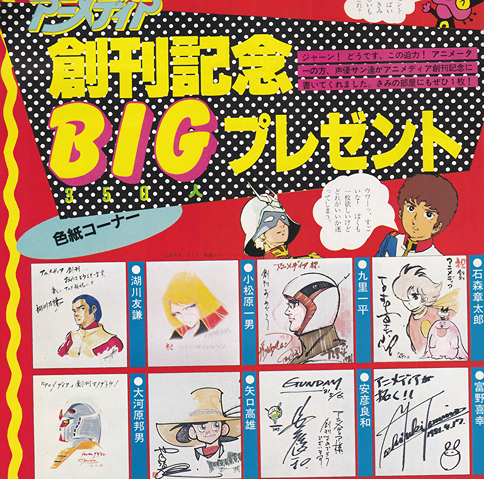 5月5日は子どもの日―ゴールデ ン・ウィークの最後を飾って、この日 東京の明治神宮・宝物殿前で『春のア ニメ・フェスティバル』(フジ・サン ケイグループ主催)が開かれた。 好天に恵まれ親子づれの行楽客など もまざって、特設ステージの前には約 5千人のファンが集まった。 富山敬、野沢雅子、神谷明、潘恵子、 戸田恵子、スラップステックの豪華メ ンバーのくりひろげるユーモラスなゲ ームや歌に、舞台はテープと声援のウ ズでうまった。「添ちゃーん」とヒゲ をはやした大学生らしい風体の、男性 ファンがあらん限りの声を上げれば 「徹ちゃーん」「ガベさーん」と女性 群からも負けじと黄色い声がかかる。 参加者をまじえてのゲーム大会、プ レゼントコーナー、アニメヒットパレ ードと内容も充実した舞台であった。 また『1000年女王』のテーマを 歌う高梨雅樹、石川まなみさんも出演。