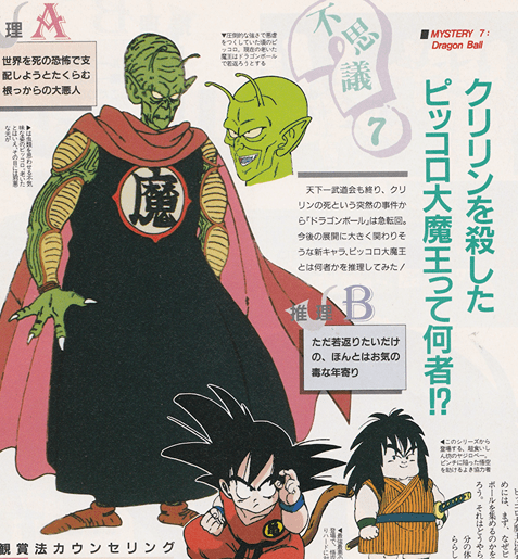 ピッコロ大魔王は何者か?を解くためには、まず、なぜピッコロがドラゴンボールを集めるのかを知っておくべきだろう。それはどうやら、老いて衰えた自分の体を若返らせたいかららしいのだが、これだけがピッコロの目的だとは思えない。若返った強力な肉体で、次に狙うものが明らかになってはじめて、ピッコロの正体もつかむことができるのだ。その目的が世界を悪と死の恐怖で支配することなのか、過去に自分を封印したものに対する復讐なのか……。よりハードな展開が予感される新シリーズに注目しよう。