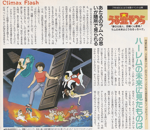 様々な未来を見ることによって生まれラムやあたるたちのリアクションが楽しい、今回の『うる星やつら』。キャラの心情を大切にアニメを作ることで定評出崎監督は『うる星やつら』を手がけるのは初めてだが、十分期待できる。まず、原作者の高橋留美子さんの、女性特有の感性を大事にしたいと思い、アニメの方もスタッフの女性の感性をうまくとりいれていこうと思いました」とりわけ、『扉を開けて』や『1人いる!』などを手がけた四分一節子さんが、今回もキャラクター・デザインと絵コンテを担当しており、隠れた監督的存在との事。では、具体的な見どころとなるポイントをいていこう。「今回のストーリーのメインとなるキャラは、因幡くんとしのぶで、いろいろな“未来を見て回って一喜一憂しているラムやあたるに対して、しのぶだけは割と冷静に見ている。もっとも、初めて未来を見た時は、あたると結婚して子供までいるわけだからビックリしたでしょうけど」ひたすらハーレムの未来を捜すあたる、ダーリンと結婚する未来を捜すラム。一行は、ついには、自らが望む未来を作ることのできる運命工場へ。この時しのぶが思い描いた未来は、現在とまったく同じままの未来であったこともポイントだ。「ラムはせっかく作った未来をのぞける扉のノブを落してしまうけど、あたるはハーレムへ行きます。しかし、数多くの美女の中にラムがいないため心配になる。その世界でラムにひどい仕打ちをしていたことを知ったあたるは、未来世界の自分に腹を立てます。ラムは男にとっては理想なんですね。自分もラムが好きなのはわかっているんだけど、かえって口に出せない。そのくせちょっとラムがいないと不安になる。そういったあたるの心の変化も、今回はいろいろな未来に行かせることによって何回か出てくると思います。本当の未来っていうのは結局誰も知ることが出来ないけれど、あたるがラムのことを普通以上に思っていることは間違いありませんからね」あたるのラムへの思いを描いた話は、テレビシリーズでも人気が高いが、今回はたっぷり見られそう。やはり、その心情こそがクライマックスといえよう。