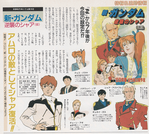 もう間もなく、制作発表が予定されている、来春公開予定の『新・ガンダム』の気になるストーリーを、事前に入手した資料をもとに一部紹介しよう。宇宙世紀0093年(『旧・ガンダム』の設定は0079年)。行方不明になっていたシャア・アズナブルはネオ・ジオン軍を再興。さらに、重力に魂を引かれた地球人を粛正するために「隕石落し」を敢行しようとしていた。これに対するは、ブライト率いるロンド・ベル隊。そしてそこには、あのアムロ・レイの姿もあった。一方、地球連邦政府高官アデナウアーは、シャアとの和平交渉に臨んだ。交渉は、「アクシズ」をネオ・ジオン軍に渡すことで決着。しかし、シャアの真意はアクシズを地上に落すことであった。敵として再会するシャアとアムロ。シャアはアムロによりピンチを迎えるが、アデナウアーの娘クェスに救われる……。ニューガンダムでシャアに対抗するアムロは!?