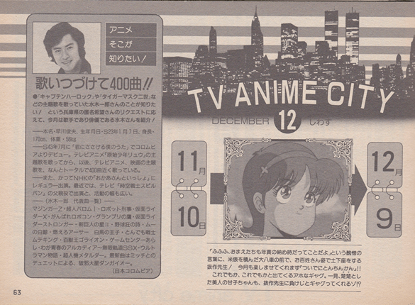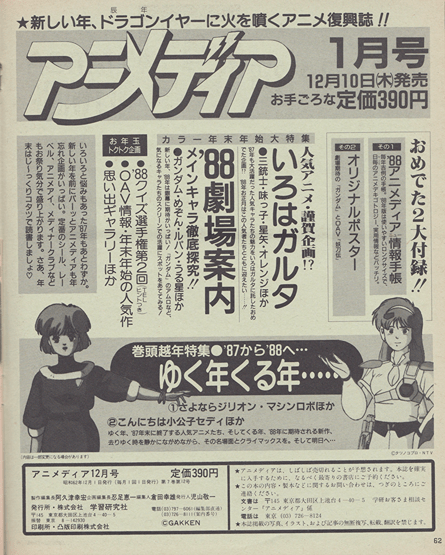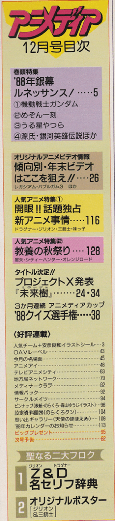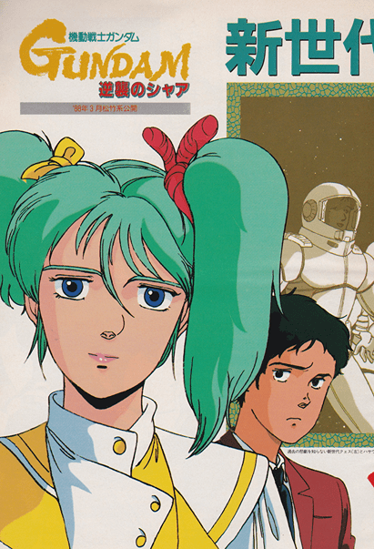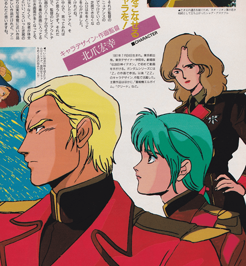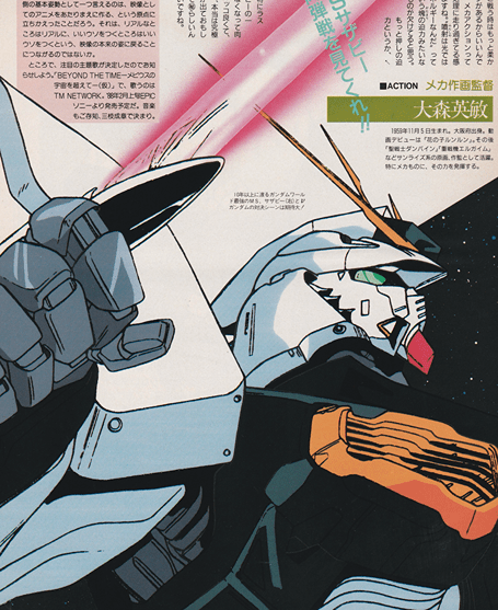 若手4人のガンダムへの意気込み、みなさんはどう感じただろうか。作品の評価は完成した映画からそれぞれが下すものだけれど、作る側の基本姿勢として一つ言えるのは、映像としてのアニメをあたりまえに作る、という原点に立ちかえったことだろう。それは、リアルなところはリアルに、いいウソをつくところはいいウソをつくという、映像の本来の姿に戻ることにつながるのではないか。ところで、注目の主題歌が決定したのでお知らせしよう。「BEYOND THE TIMEーメビウスの宇宙を超えてー(仮)」で、歌うのはTM NETWORK。’88年2月上旬EPICソニーより発売予定だ。音楽もご存知、三枝成章で決まり。