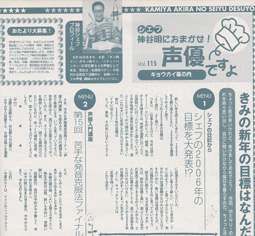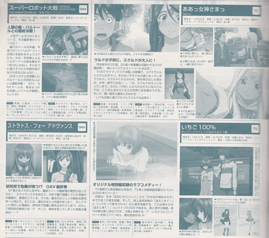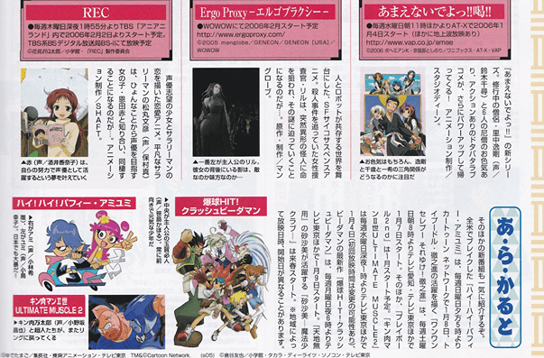 pg. 38: Papillon Rose, Kage kara Mamoru!, Nerima Daikon Brothers, Yomigaeru Sora: Rescue Wings, Ginyuu Mokushiroku Meine Liebe Wieder, Magikano, REC, Ergo Proxy, Amaenaide yo!! Katsu!!, Hi Hi Puffy AmiYumi, Bakukyuu Hit! Crash B-Daman, Kinnikuman II Sei: Ultimate Muscle 2