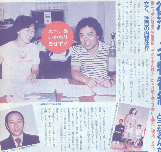 上野はた金次郎と山津夕紀です。 山津さんは、 昨年の「アマチュア声優コンテスト」の 入賞者で、今年、短大1年生の18才です。 あとは、 アニメ・レポーターの岡本リン 子が出演します。