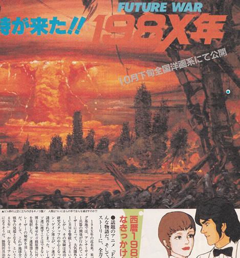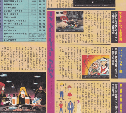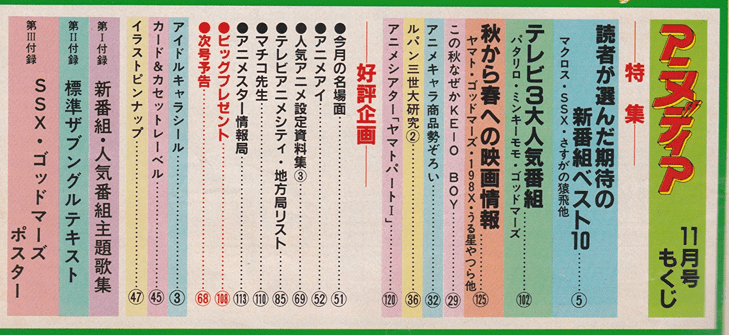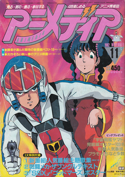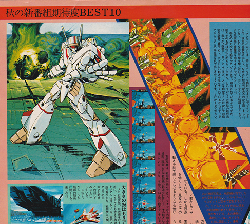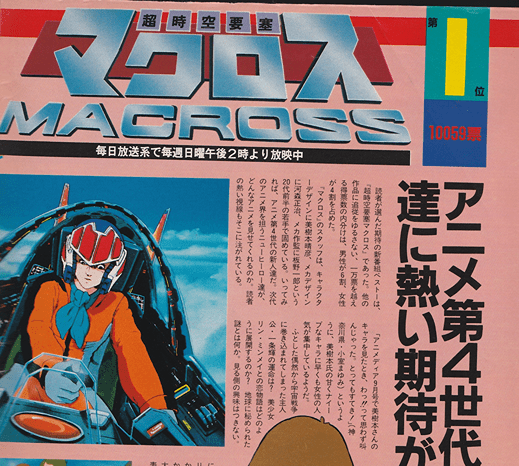 読者が選んだ期待の新番組ベストーは、 『超時空要塞マクロス』であった。他の 作品に追従をゆるさない、一万票を越え 得票数の内分けは、男性が6割、女性 が4割を占めた。 『マクロス』のスタッフは、キャラクタ デザインに美樹本晴彦、メカデザイン 河森正治、メカ作監に板野一郎という 20代前半の若手で固めている。いってみ れば、アニメ第4世代の新人達だ。次代 のアニメ界を担うニューヒーロー達が、 どんなアニメを見せてくれるのか。読者 の熱い視線もそこに注がれている。 「アニメディア9月号で美樹本さんの キャラを見たとき、わっ!って思わず叫 んじゃった。とってもすてき!」(神 奈川県・小室まゆみ)というよ うに、美樹本氏の甘くナイー ブなキャラに早くも女性の人 気が集中しているようだ。 ふとした偶然から宇宙戦争 に巻き込まれてしまった主人 公・一条輝の運命は? 美少女 リン・ミンメイとの恋物語はどのよ うに展開するのか? 地球に秘められた 謎とは何か。見る側の興味はつきない。 また、男性読者の多くは「と にかくスタジオぬえの精巧で リアルなメカが、どう動くの か。それを考えただけでも今 からワクワクする」(東京都・ 大西健一)といった意見に代 表されるようだ。 一・二キロメートルという 今までのアニメ では見られなか った超巨大戦艦 マクロス。この 戦艦は他の二隻 の戦艦と合体し て超巨大ロボに 変形する。この 巨大さをどのよ うに表現し、どのように動かすのか。メ カファンならずとも見のがせない。 とにかく、アニメ第4世代の旗手とも いえる新人達が、ファンの熱い期待に、 どのように答えてくれるのか。 ファン注目の中、10月3日、ついにベ ールをぬいだ 『マクロス』のハイライト シーンを見ながら、その動き、ドラマ性 を断してみよう。