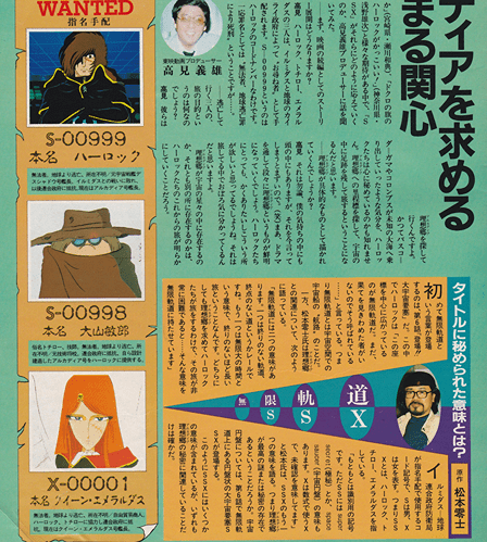 めて無限軌道と いう言葉が登場 するのは、第6話「登場!! 大宇宙要塞」だ。この中 でハーロックは「この座 標を中心に広がっている のが無限軌道だ。まだ、 果てを見きわめた者がい ないのでそう呼ばれている ・・・・・・」と言っている。つま 無限軌道とは宇宙空間での 宇宙船の航路”のことだ。 一方、松本零士氏は理想郷 との関連について、次のよう に語っている。 「無限軌道には二つの意味があ ります。一つは終りのない軌道、 終点のない道というかレールで すね。もう一つは無限大の時間と いう意味で、終りのないほど長い 旅ということなんです。どちらに しても理想郷を求めてハーロック たちが旅をするわけで、その旅が非 常に困難であると・・・・・・そんな意味を 無限軌道に持たせています」 ルミダス地球 連合政府防衛局 が指名手配で使用するコ ード記号で、Sは男、X は女を表す。つまりSS Xとは、ハーロック、ト チロー、エメラルダスを指 している。 「もともとは識別用の記号 です。ただSSには super secret (極秘)とか、space saucer (宇宙円盤)の意味も あります。Xは数式で使うX で、未確認を意味してます」 松本氏は、SSXのもう一 つの意味を語る。つまり理想郷 が最高の謎または秘密の存在で あるということだろうか。宇宙 円盤については、第6話で無限軌 道上にある円盤状の大宇宙要塞S SXが登場する。 このようにSSXにはいくつか の意味が含まれているが、いずれも 理想郷の秘密に関連していることだ けは確かだ。
