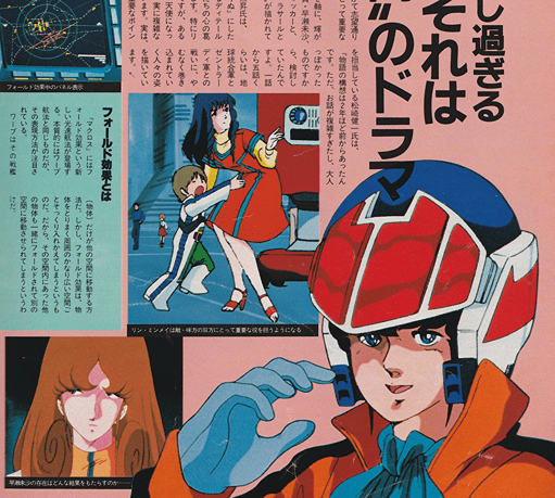 五話あたりから『マクロス』の根本的 な疑問や謎がでてきて、十話あたりで明 かされます。これが後半の人間ドラマの ポイントになりますから、見のがさない ようにしてください」と語っている。 見のがせない話題をもう少し紹介しよう。 編集部が極秘で入手した情報によると、 男性ファンの注目の的であるリン・ミン メイの入浴シーンが、早い話数で登場す るかもしれないということである。 それから、地球と巨大戦艦マクロスの 秘密を解く小道具として、マクロスの艦 内にあるちょっとした日常品が使われる らしい、ということだ。 平凡な少年が戦争に巻き込まれて、戦 いの中で様々な人間と出会い、やがて二 ュータイプに目覚めるといったストーリ ーは『ガンダム』だった。このマクロス の輝は、同じような経過をたどりながら、 どのような成長を見せてくれるのか。 そのドラマに期待しよう。