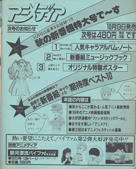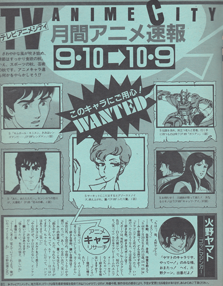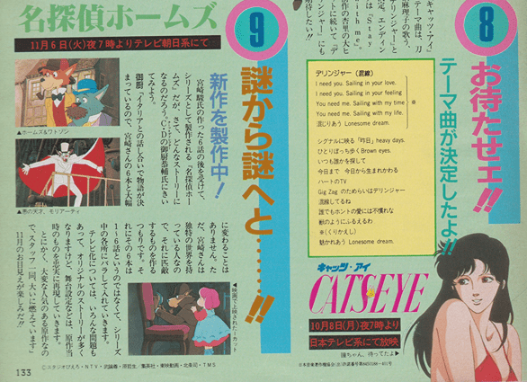 pg. 132-133: Galactic Patrol Lensman, Ashita Tenki ni Naare, Sei Juushi Bismarck, Fist of the North Star, Sherlock Hound, Cat’s Eye