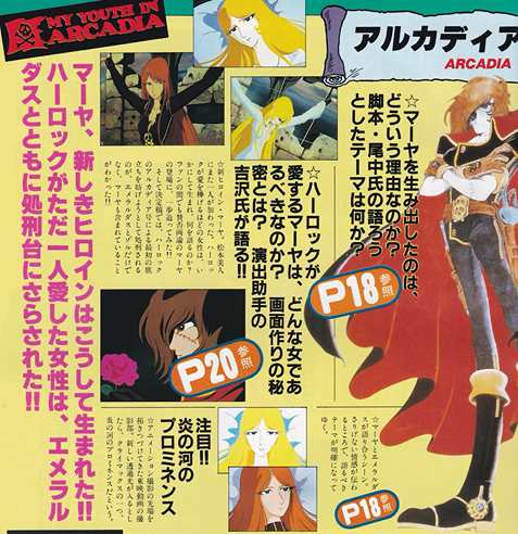 「アルカディア」のキャラクターが 決定した。御馴染のハーロックやエ メラルダスに加え、劇場用オリジナ ル・キャラクターも出揃ったようだ。 まずミーメだが、名称がラ・ミ メに変更された。TVシリーズのミ ーメとは別人として登場するらしい。 ミーメの姉か妹の役という可能性が 強い。 今回の最大の注目キャラクターは マーヤだろう。作画監督の小松原一 男氏の言ったように、まさに“白の イメージ”のヒロインに仕上がって いる。早く大画面で彼女に会いたい ものだ。 他にも、イルミダスの司令ゼーダ その忠実な部下ムリグソン、トカー ガ人のゾル、その妹ミラなど、その 役柄に合わせて、キャラクターが設 定されてある。
