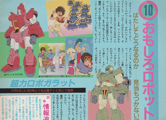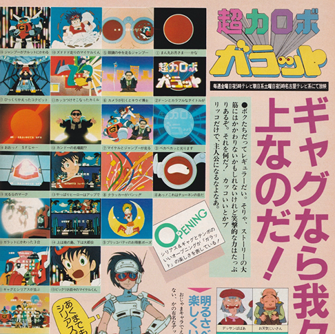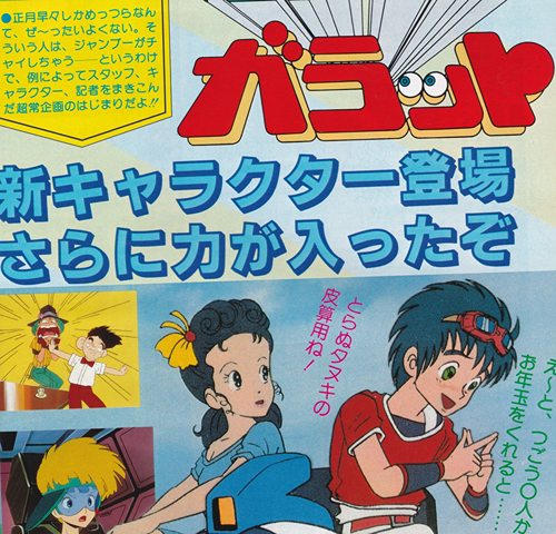 エンディングの方は、ボクらと同じようなデザインになった主人公が、ちょこちょこ歩いて、これまたかわいいじゃないか。でも、ああいう役こそ、ボクらのお得意なんだぞ(ごく一部をのぞいて・・・・・・)。網野「あれは、コミカルな絵で、シリアスな演技をさせようというのが狙いです。『ガラット」って、内容はけっこうハードなんです。それで、エンディングはどうしようかって、迷ったんですが、芦田さんが2等身キャラのアイデアを出してくれましてね」もうオープニングやエンディングに出ることは、あきらめた。ボクらの役割をアニメディア読者のみなさんに説明してよ。せめてそのくらい……ねェ、おとさあん。網野「やはり、こういう作品ですから、楽しくやりたい。ですから、群衆シーンなんかでは、見たことのあるキャラが出ていますよ。オジャマキャラなんかも、楽しいイメージ作りには欠かせませんね。毎回、新たな楽しみのあるんな作品です。見てください」そうか!!!そうだったのか!! ボクらは偉いんだ。マイケルやパティが何だ。キウイが何だ(ドスコイ姉妹はコワイけど……)。これからも、本編の中で、ひょこっと顔を出すから、ぜひ応援してね。(主人公もついでにヨロシク!!)。