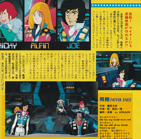 当が押しの一手で「洋画、洋画!!」 と言っていたので配給会社の松竹 が洋画館にかけてくれることにな りそうだ。これでまともなステレオ で、ドルビーをかけた「ジョウ」が見 られる。しかし、上映館が少なくな るので多少不便になるファンがいる かもしれないが、アニメだって洋画 館にかからないと一人前じゃないの だから、ぜひ応援してください。