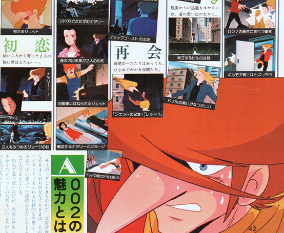 いつもニヒルにきめ、肩ひじはっていた002も、昔の仲間の事件をきっかけに、弱さと内面の温かさ、サイボーグであることの運命をいまさらながらに知らしめてくれた。この002の性格設定などについて、スタッフはどのような考え方に立っているのだろうか。鈴木プロデューサーは、「基本設定では、武器とふだんの生活についてまず決めました。武器は原作にあるよう空を飛べること。もちろん、宇宙でも飛びまわることができます。002の社会的な面では、09とともに活躍しているレーサ1の一人。きっぷと度胸のよさがある。性格では、004の静に対して動の性格。ヤンキー魂に満ち満ちている。だが育ちのため、皮肉っぽさ、まず疑ってかかるひねくれたところをもたせる……。というものでした」とこたえてくれた。物語のなかで、002のヤンキー魂に接し、声を吹き込んでいる野田圭一氏は002をこう語っている。「002には、きっぷのよさ、歯切れのよさ、そしてすれた部分があるめめしさもあってもいいのでは。役としては、ぼくも短気なところがあり、白黒をはっきりさせたいほうなので性格的にも似ていてやりやすい。002はウエストサイドの話で、サイボーグに対するヒューマンな部分は終わったと思う。ふつうの人間に対する感情はふっきれたのでは。これからはもっとクールに生きるしかないのではと思う」