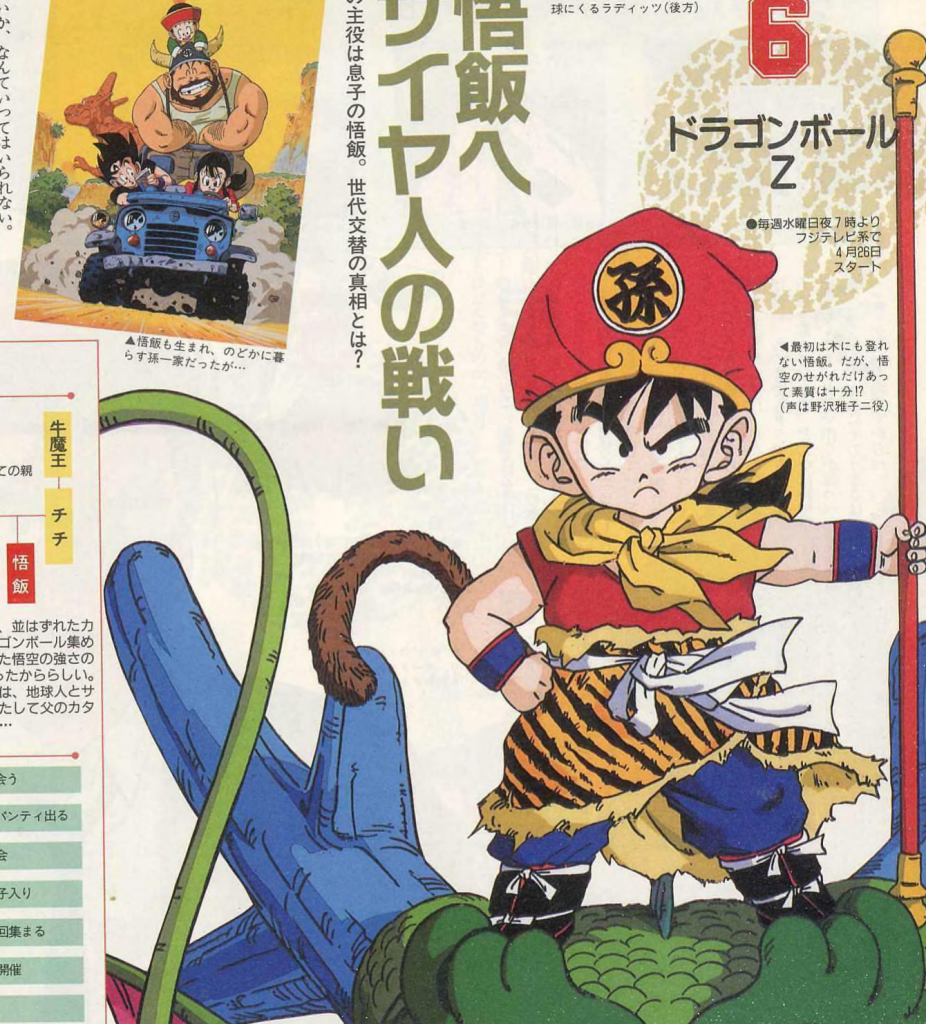 - October ’90 [AM]: 孫悟空の運命 10月3日、よる7時から1時間、『ドラゴンボールZスペシャル 外伝・孫悟空の父』が放送されるぞ!!!ますます激しい死闘がつづくナメック星、恐るべきフリーザをまえにいったいなにがおきるのか?!?! 今日の悟空たちの運命は、すでに25年前からはじまっていたのだ。25年前、惑星ベジータにひとりの男の子が産声を上げた。名まえはカカロット、戦闘力はたったの“2”。その男の子の父は、サイヤ人のなかでも最下等の兵士バーダック。フリーザの野望、サイヤ人の全滅計画を知ってしまった唯一のサイヤ人なのだ。ドラゴンボールの壮大な物語の幕開けまえを、父・バーダックの生きざまをとおして、子・孫悟空の運命を完全オリジナルで見せてしまうのだ。もちろん、幼いころのベジータも登場するぞ。(Kōzō Morishita)