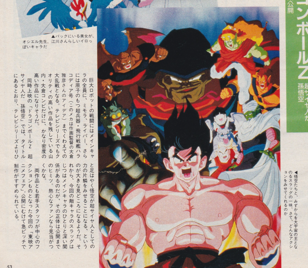 - April ’91 [AM]: アニメ映画のパワーを堪能 いよいよ悟空が数段のパワーアップで復活。あのギニュー隊長との死闘から、じつに3か月半ぶりの登場だ。対するフリーザの凶悪超絶パワーも、ますます凄味を増して、悟飯、クリリン、ベジータ、そしてピッコロも赤子扱い。元気復活の悟空との一騎打ちをみんな期待してくれよ。公開されるたびに大ヒットをつづける「ドラゴンボールZ」シリーズの映画も、今回で第4弾。「超サイヤ人だ孫悟空」が3月9日(土)、全国の東映劇場で一斉に公開されたぞ。監督に橋本光夫氏、作画監督に中鶴勝祥氏と佐藤正樹氏のアニメ界の若手ホープが全力で取り組んでいるぞ。そしてふたりの師匠である前田実氏が作画全般をバッチシ監修、いままで以上の画面の厚さ、アニメーション映画の持つエネルギーを堪能してください。 (Kōzō Morishita)