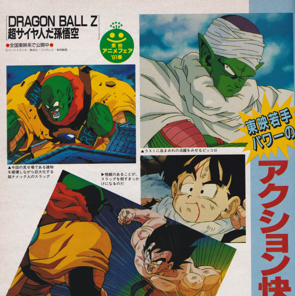 - March ’91 [AM]: ふくれあがるパワーゲーム「ドラゴンボール」劇場版もついに第4弾だ!! タイトルも「超サイヤ人だ孫悟空」だけどこんどの相手はただ者ではないぞ。あのピッコロを赤子扱いの、究極の戦闘生物、超ナメック星人・スラッグだ。倍の倍の倍に膨れ上がるパワー・ゲーム。強い強い悟空と、最強の敵スラッグの、大型画面での一騎打ち。絶対に見に来てくれよな!!テレビもいよいよピッコロが復活、3段変身のフリーザとの死闘が見逃せないぞ。奇想天外なキャラクター、独特の描写、夢とアクションの物語、「ドラゴンボールZ」は、今年もスタッフともども、絶対好調だ!! (Kōzō Morishita)