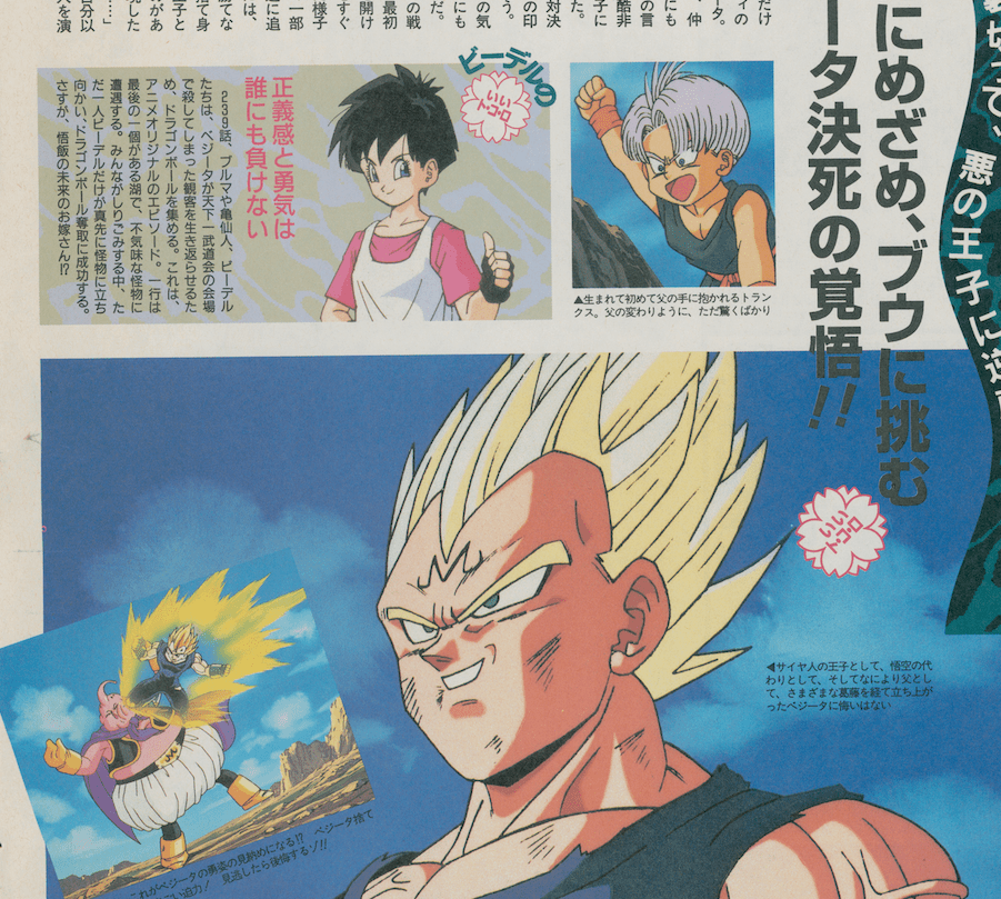 - January ’90 [AM]: フィナーレを飾る大決戦 お待たせしました。「孫悟空 ベジータ・世紀の一騎打ち」、80年代のフィナーレを飾り、ドラゴンボールZ・サイヤ人編、最高のクライマックスがはじまります。スカウターの計測では圧倒的なパワーを誇る宇宙一の強戦士ベジータが勝つか、戦うたびに強さを増す悟空の底知れぬパワーが勝つか!?!?絶対に損はさせません。みなさん大いに期待を持ってご覧ください。そして…!!ついに90年春、映画版『ドラゴンボールZ』第2弾が全国東映系で公開されます!時間もグーンと長くなり、内容もボリュームUP! ’89年も残りあとわずか、『ドラゴンボールZ』は数々の話題が大爆発して、絶好調で新しい世紀、90年代に突入します。ヨロシクッ! (Kōzō Morishita)