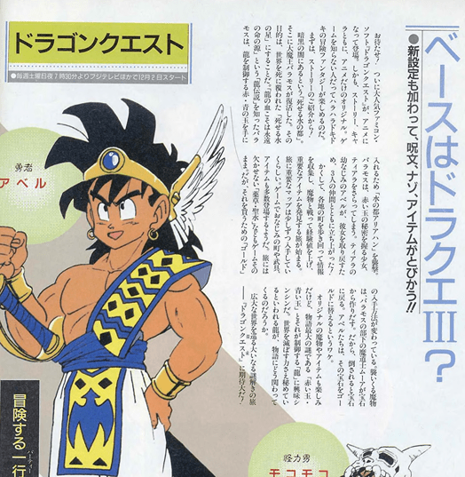 - December ’89 [AM]: アニメならではの”ドラクエ” – あの大ヒットとなったファミコンゲームの「ドラゴンクエスト」が、ついにアニメになって12月2日からスタートします。「なんだ、ゲームソフトの人気に便乗してアニメ化されるだけじゃないか」と思われる方も多いでしょう。でも、このアニメ「ドラゴンクエスト」はちがいます。スタッフ一同真剣になって、本格的なアニメ作りをしようという作品です。さて、アニメの「ドラゴンクエスト」のストーリーラインはIからIIIまでのゲームソフト、『週刊少年ジャンプ』で現在連載中のマンガ、そしてエニックスから出版されている単行本の小説ともまったくことなった完全なオリジナル。やはり冒険ものである以上、視聴者の方々にあらかじめ物語の先がわかってしまっていたら、おもしろさが半減してしまうと考えたからなのです。けれども「ドラゴンクエスト」である以上、モンスターや呪文、アイテムなど「ドラゴンクエスト」には欠かせない要素は、もちろんゲームソフトに則した形で登場します。また、ゲームの「ドラゴンクエスト」をやったことのない人には「ドラゴンクエスト」の世界がどんなものなのかを十分理解できるように、そして、やったことのある人にも絶対楽しめるよう作られています。とにかく、原案・堀井雄二、キャラ原案・鳥山明、監督・りんたろう、音楽・すぎやまこういちというビッグな組み合わせの企画です。ゲームとはまたちがったアニメ「ドラゴンクエスト」の壮大な冒険世界にいちどひたってみてください。(Tetsuo Daitoku)