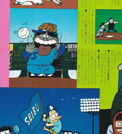 Shigeru Akagawa: 前作が大ヒットしたので、この第2弾も、できるだけ多くの劇場で一斉に封切りたいですね。今回も勿論、1話10分位の9回戦マルチ・ラウンド方式でやります。第2作の見どころは、タブチくん以外に、原作の漫画でかなりウケた実在のモデル、ヤスダはじめツツミ、プロ野球ニュースのササキ・キャスターなど、多勢のキャラクターに登場してもらうところです。特に、タブチくんと並んで人気抜群のヤスダが、前作では1~2話ぐらいしか出なかったのが、今回は全般にわたって登場し、かなりタブチくんに絡みが多いのも特徴です。野球以外のところでも、ヤスダがゴルフのキャディになって出て来るなんて話もあります。やっぱり「タブチくん」が大ウケするのは、実在のモデルを使って、それを面白おかしくオチョクッていくところにあると思いますね。唯、その人物を傷つけるようなところまで行ってしまえば、それはギャグではなくなってしまう。まあ、笑って済ませる範囲でオチョクッてみようというのが、セールスポイントです。安田選手なども前作の試写会に来て、「オレはこんなにひどかないけど」なんて笑いながら、結構楽しんでおられましたよ。モデルに使った人たちは、別に本人の諒解を得ているわけではないんですが、「モデルにしますのでよろしく」なんて諒解貰ったら、パロデとしての面白さがなくなっちゃう。モデルになった人たちも、オレはどんなふうに扱われてるんだ?っていう具合に、ジョークとして楽しんで貰えればいいんじゃないかな。前回の皆さんの御意見を聞くと、最終話が飛び抜けて面白かったそうですが、しかし中にはつまらなかった話もあったようでスタッフも劇場で観客の皆さんと一緒に観て、どこで皆んなが笑うかということも研究しましたし、一般の意見を参考に、つまらない話がないよう工夫しました。全体的にレベルアップしたギャグをお観せしますので、期待して下さい。「がんばれ!タブチくん!!!」の第2弾には、お馴染みヤスダ、ヒロオカなど、たくさんのパロディ・キャラクターが登場します。それらのモデルが一体どんなふうにパロってあるのか、興味のあるところ。ちょっとシナリオを覗いて、キャラクターの特徴がバッチリとらえられている楽しいセリフを紹介しましょうネ。(他ニシモト、ヤマトからヤスダネコ、バイトくんも出ますヨ!)