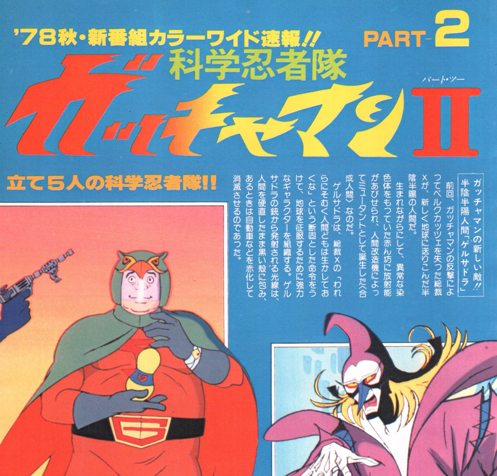 ― 「ゲル」は、ドイツ語で”欲望”を「サ「ド」は“残虐性”を表わしています。前回のガッチャマンで、ベルクカッツェが人気が高かったので、そのイメージをあまり変化させないよう、つくりました。(脚本・鳥海尽三さん談)スタッフが新たなる熱意をもって創造したゲルサドラ。この新キヤラにも熱い視線が集まるのは、確実だ!!