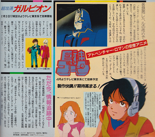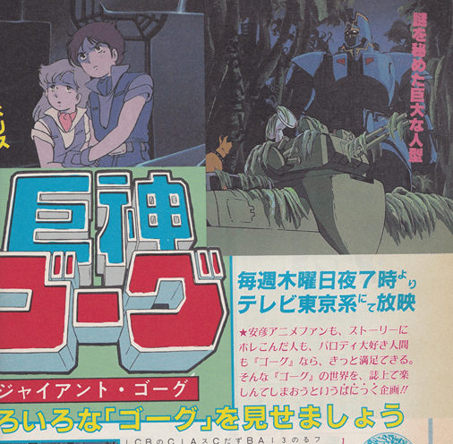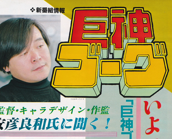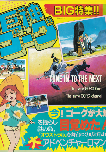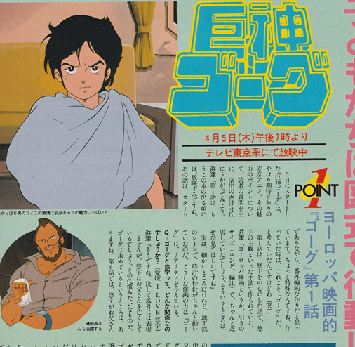 安彦良和氏が監督、作画監督して制作に入った『巨神ゴーグ』は、10月3日(月曜日)夜7時30分よりテレビ東京系での放映が決定した。物語は、南太平洋上の孤島オウストラル島にあると思われている秘密を捜し求める少年・神悠宇と、交感によって意志を通じあえた高度な知性ロボット“巨神ゴーグ”を中心に展開されるスリルに富んだ冒険作品となっている。島にかくされた秘密を解くカギとなるゴーグとは、誰が造ったロボットなのか? 秘密を巡って悠宇の回りに、巨大企業GAILとギャング団の不気味な影がちらつく。「孤島を舞台に、少年の生き生きとした姿を描いていくこの作品は、地球を舞台にした地味な作品ですが、ハイレベルな作品になるでしょう」と吉井孝幸プロデューサーは語る。