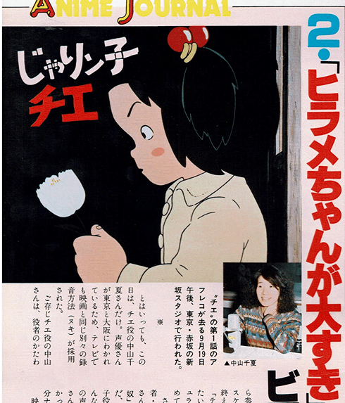 ○東京・高円寺にあるスタ ジオテレコムで、「チ 「エ」の制作は着々と進んで いる。このスタジオの強み は、ほとんどのスタッフが ワンフロアで作業を進めて いる事。原画や動画、美術 の人がズラーッと机を並べ ているその隅っこで、 作監 の大塚・小田部さんも、セ ッセと仕事をしている。そ の机の間を、高畑さんが腕 組みしながらウロウロして いるといったぐあい。 とにかく、みんなのコミュ ニケーションがバッチリだ、 っていうところに、東京ム ービー作品の強みがあると 言えそう。チエの制作も、 「そろそろ動画が追い込み に入り、撮出しも快調!」 (制作・仙石氏)だそうだ。 ○長いこと未定だった花井 拳骨は笑福亭仁鶴に決定。 アフレコは、さすがに関西 の役者さんが多いため、東 京と大阪に分けて行われる 東京のアフレコスタジオ、 東北新社では2月8日から 10日まで、チェ役の中山千 夏を中心にアフレコが行わ れる。とにかく忙しい役者 さんばっかりだからアフレ コはたいてい夜から深夜。 国会がお休み(?)の日曜日 だけは、日中もできるそう で、いやはや大変です。 2 月13日から15日まで、鳳啓 介、京唄子、三林京子、仁 鶴らが大阪でアフレコ予定。 ○ところで原作者のはるき 悦巳さんってどんな人なの だろう。マスコミに顔も声 も手も出さない売れっ子ス ターの素顔をちょっとご紹 介すると はるき氏は大 のジャズでレコードマニ ア。下積みの頃の収入は全 てレコードに消えたとか。 以外なことにお酒は一滴も 飲めず、原稿書いてる時は バヤリースオレンジとコー ヒーをガブ飲み。さすが!