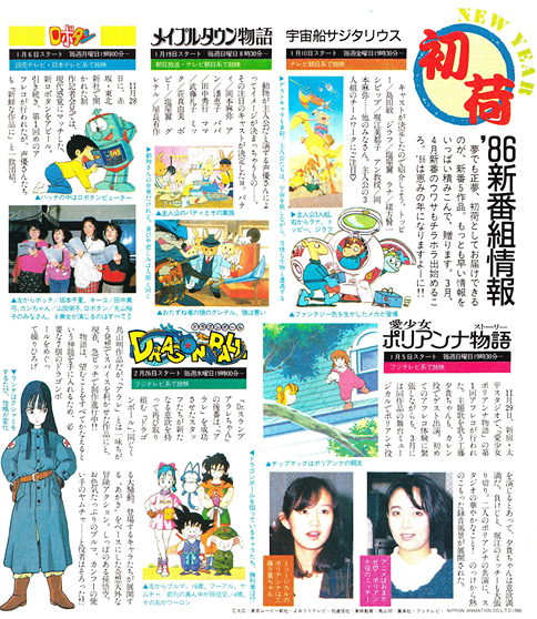さまざまな動物たちが暮らす街メイプルタウンを舞台としたオリジナル・メルヘンが、東映動画制作で1月19日よりスタート。「オリジナル作品の魅力でもある新鮮で愛らしいキャラクター、動物アニメの特徴ともいえるかわいらしい動き。このふたつがポイントになります。ウサギ、クマなど種類の動物で一家族を構成し、家族のつながりや役割のあり方も盛り込んでゆきたい。家族形態がこわれつつあるいまだからこそ、こんなアニメが必要なのではないでしょうか」と話すアシスタント・プロデューサーの高橋尚子さん。キャラ設定はベテラン二宮常雄さん、チーフ・ディレクターは佐藤順一さんと「メモル」「ステップジュン」のメンバーを中心に構成されているが、脚本の金春智子さんなど女性スタッフの参加もめだつ。「女らしい繊細な感性、微妙な心理描写がいかせたらと思う」と話す高橋さんのことばに期待したい。