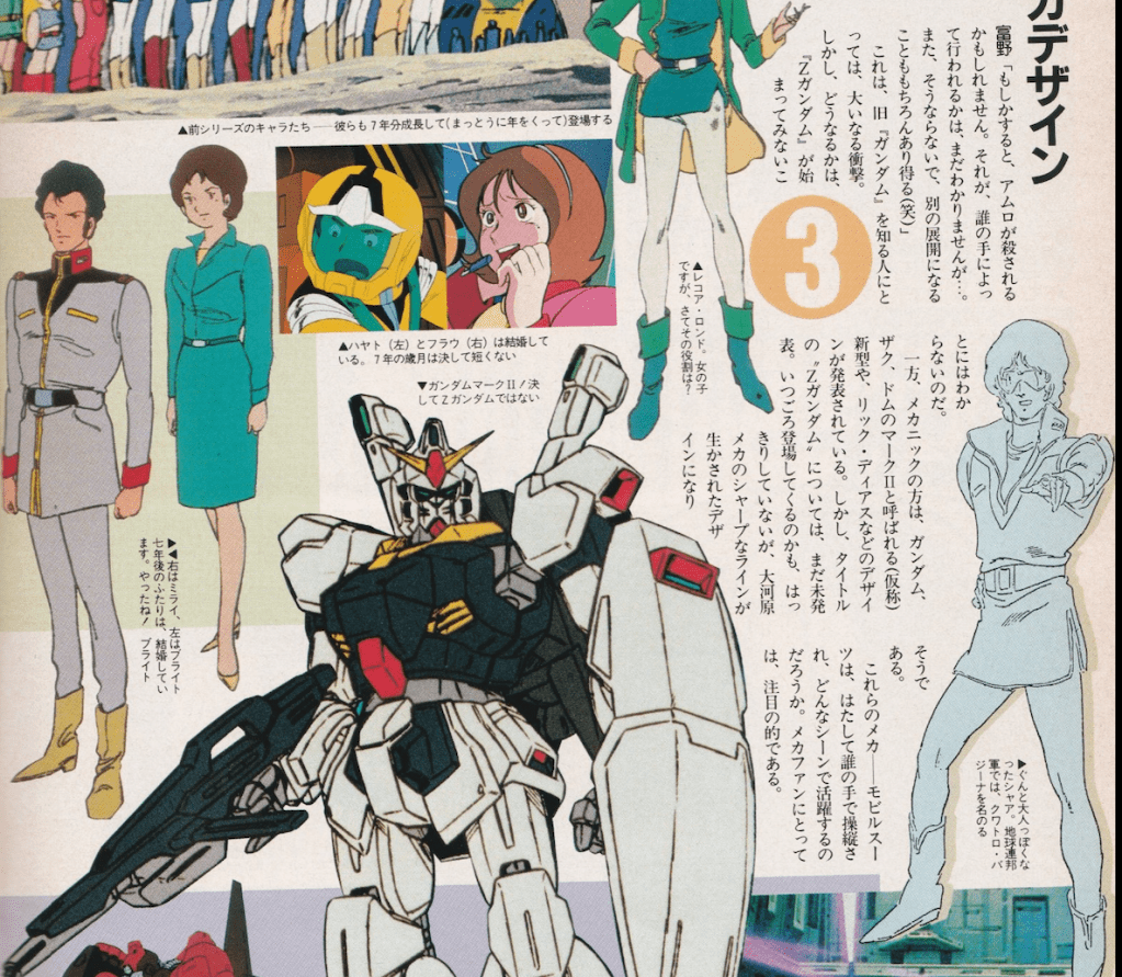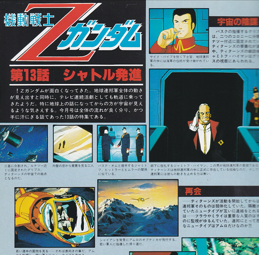 ロボットの魅力プラスアルファ”がなくては、これからの人気アニメ戦線は生き抜いていけない!?!?! 現在放映中の3本のSFメカ・ロボ作品にはそれぞれプラス”何か”があるのだ。エース格の『Zガンダム』には前シリーズから引きつがれた、人間が人間であるがゆえに生まれるドラマがその根底に息づいている。さて、本数減少などパワー低下の感が否めないSFメカ・ロボ作品の救世主的存在ともいえる『Zガンダム』。内田健二プロデューサーは「SFはメカのみに・・・」のコンセプトに対し「正にその通り」と。人間ドラマとしての面をクローズアップするとらえ方は、制作サイドの意図にも合致しているといえよう。ただ、〝新しさに固執して、『Zガンダム』を考える時、問題になるのが、第1話の冒頭部分や第12話のジャブロー降下作戦といった『ガンダム』をなぞるような部分。果たして、『Zガンダム』は『ガンダム』のいわゆるパートⅡなのか否か、ということをいま一度考えなくてはならないのだ。