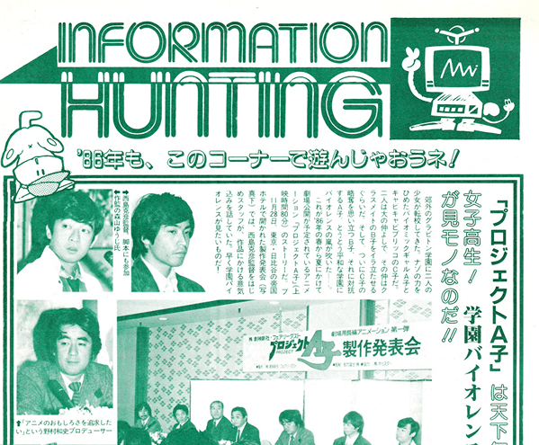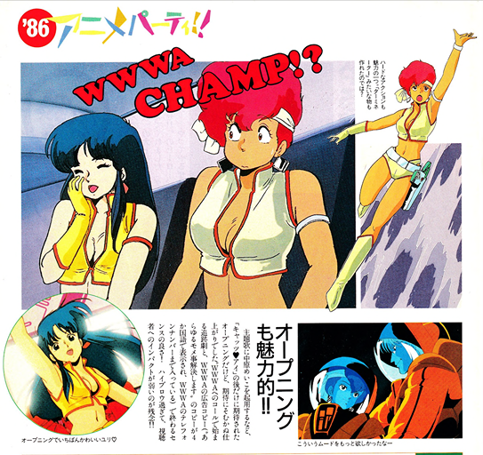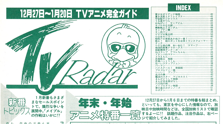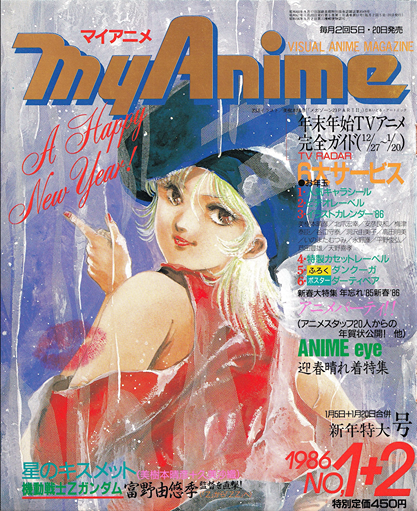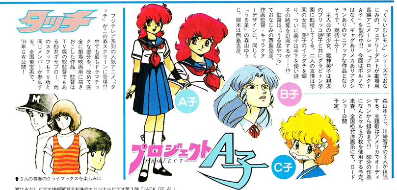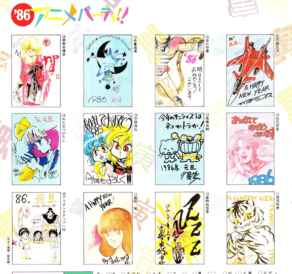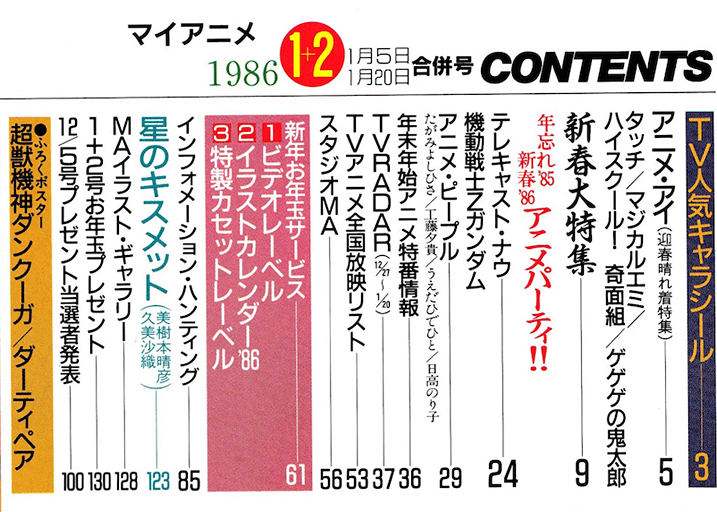 pg. 16-27: Uchuusen Sagittarius, Robotan, Maple Town Story, The Story of Pollyanna, Girl of Love, Dragon Ball, Layzner, Gundam, Captain Tsubasa,